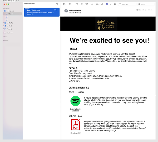 In order to boost confidence and build anticipation for the opera, we need to provide more resources and information to help prepare Careful Critics for their visit. A Spotify playlist of the opera music and a downloadable PDF with production information, singers’ biographies and a synopsis will be included in an event reminder email and will be sent to them 2 days before the performance.